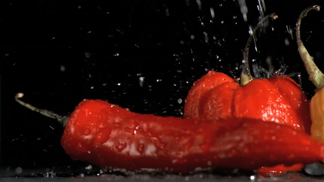 Super Slow Motion of Water Spraying on Red Chillies Video