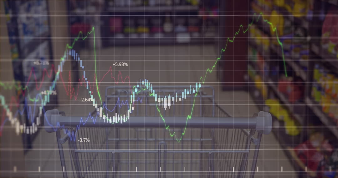 Image shows a supermarket shopping cart with digital financial data overlay, reflecting stock price variations and charts. Ideal for articles or presentations on the intersection of retail and finance, impacts of economic changes on shopping behavior, or analyses on investment trends in the grocery sector.