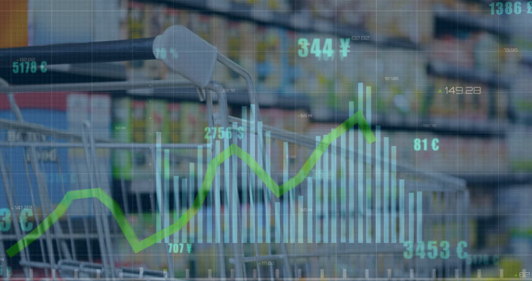 The video depicts a shopping cart in a superstore with overlaid technical graphs and financial metrics, reflecting business analysis concepts. Ideal for illustrating economic literature, business performance reports, or financial presentations, emphasizing market trends and consumer behavior analysis.