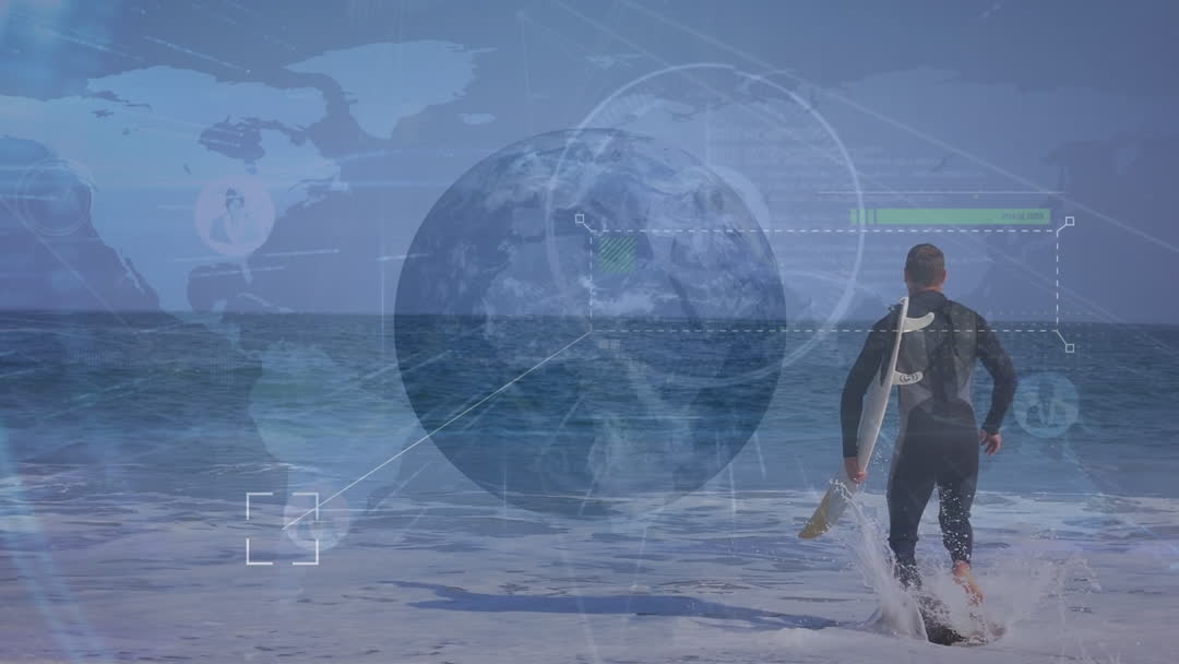 Illustrates fusion of technology and sports with a surfer entering ocean waves while digital graphics overlay. Useful for themes like global connectivity, digital advancement in sports technology, promoting active lifestyles digitally, or the synergy between athletes and technological progression.