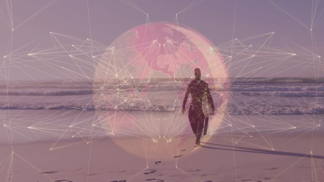A man in wetsuit is carrying a surfboard while walking along the waves, with a digital globe and network overlay symbolizing connectivity. This videory champions the spirit of exploration and adventure skilled by vitality and technological innovation. It can be symbolic for campaigns that merge nature with modern technology, promoting possibilities within skateboard innovations near coastal zones.