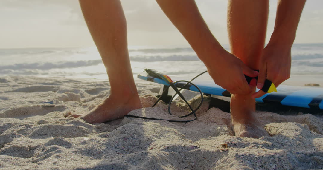 - Surfer Securing Leash Ankle Strap on Sandy Beach Sunrise