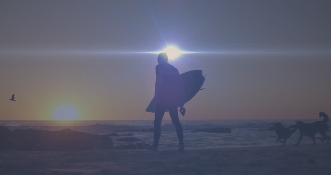 A silhouette of a surfer carrying a surfboard while walking along the beach at sunset, with a radiant sunlight effect in the background. Dogs are visible playing near the water, adding to the relaxed and carefree atmosphere. This videory is ideal for travel and vacation content, highlighting coastal lifestyles, adventure tourism, and seaside relaxation. Perfect for promotional material in surf-related advertisement, travel agency brochures, or websites showcasing coastal retreats.