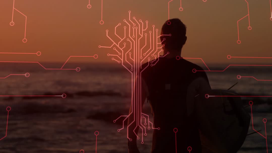 Surfer Walking Towards Ocean with Futuristic Digital Overlay Video