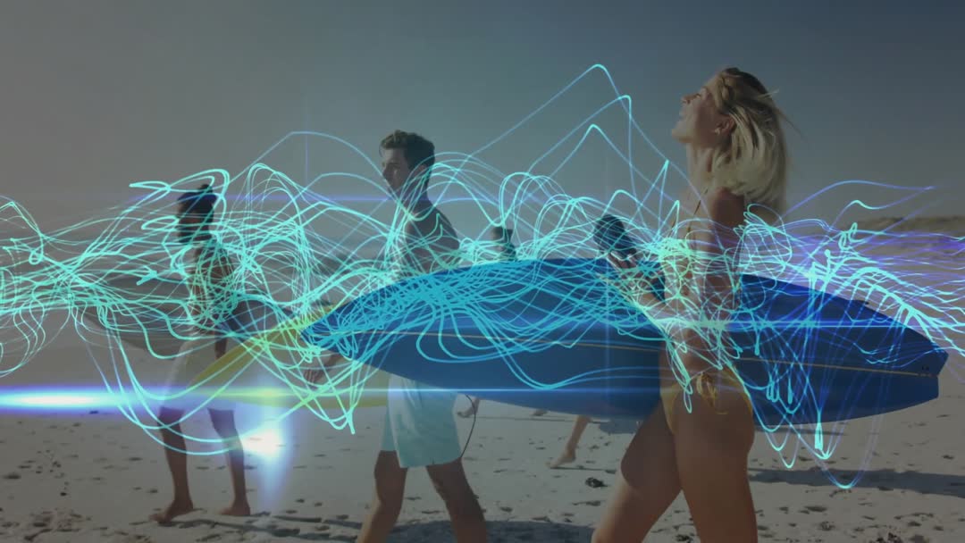 Group of surfers walking along beach carrying surfboards with vibrant technological lines flowing besides kits. Conveys balance between nature and technology, suitable for themes of innovation, summer adventures, outdoor activities, and dynamic lifestyles.