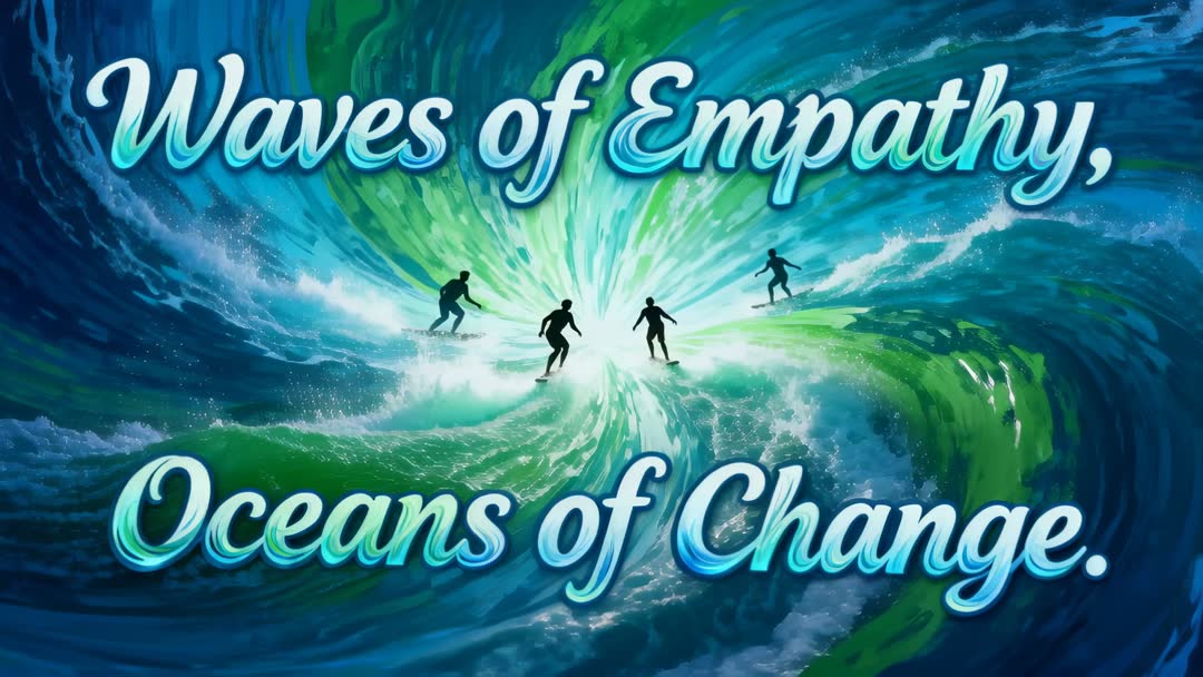 AI Generated Image. Clip showing four wetsuited surfers riding inward toward bright central vortex light surrounded by swirling green-blue ocean waves. Silhouettes leaning inward and converging at center, creating strong sense of unity, teamwork, and forward motion. Stylized color palette and poster-like composition giving cinematic, high-energy mood with dramatic light and fluid motion. Suitable for motivational campaigns, surf brand advertising, corporate team-building videos, event intros, environmental awareness pieces, social media reels, and background for podcasts or presentations. Use as homepage hero, YouTube intro, festival trailer, or poster artwork to evoke adventure, collaboration, and transformational change.