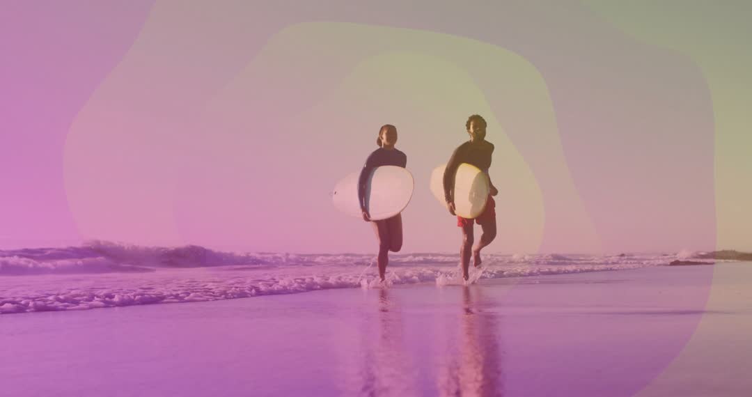 Vibrant video of two surfers running along the beach with boards under arm, featuring dynamic technology overlays. Burst of colors adds futuristic feel to outdoor adventure and sportsmanship moment. Perfect for lifestyle content, tech industry showcases merging digital innovations with outdoor activities, and businesses targeting young, active audience.
