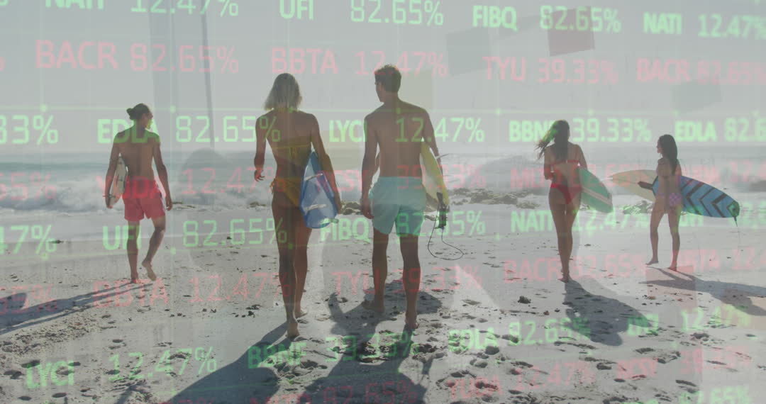 Multiracial friends walking on beach with surfboards overlaying digital stock market data create a vibrant juxtaposition of leisure and finance. Ideal for themes related to balancing lifestyle choices, market analysis concepts, vacation planning, or investment opportunities. Blends carefree sunlit freedom with analytical precision of stock trading.