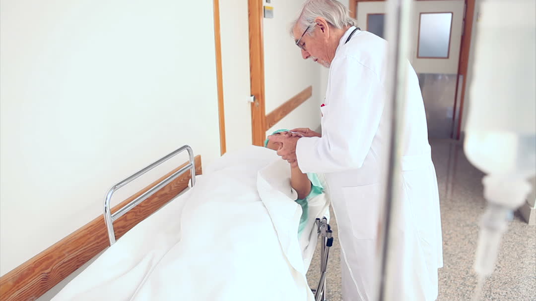 An elderly male surgeon dressed in a white coat attentively checks an intravenous drip beside a hospital bed. Located in a hospital corridor, the scene illustrates patient care and medical preparation within a healthcare facility. Suitable for use in articles discussing hospital environments, medical professional skills, or healthcare procedures.