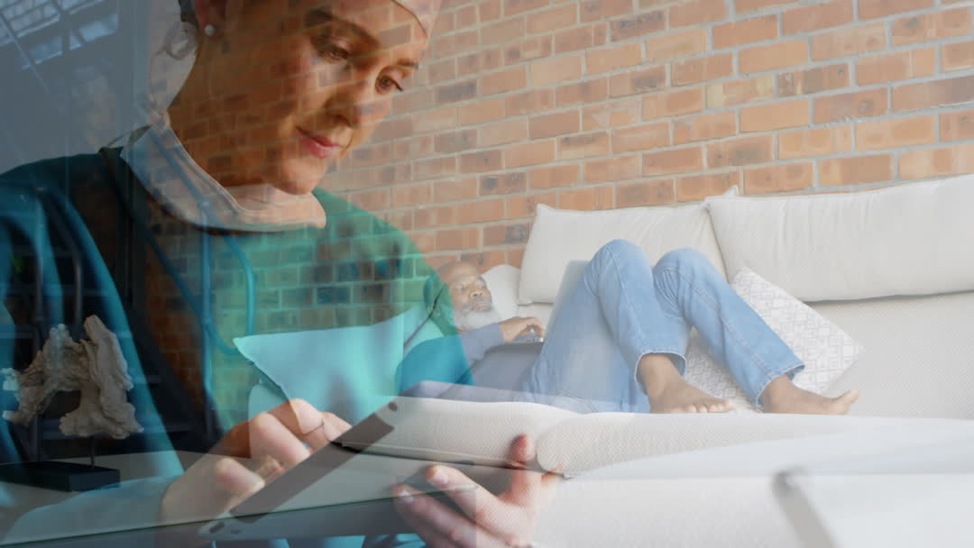 A thoughtful surgeon focusing on her work with a transparent overlay featuring an elderly woman relaxing on a sofa. This visual uses juxtaposition to represent the intersection of medical expertise and patient experience. Useful for illustrating topics in healthcare, wellness, or balance in lifestyle for promotional materials or educational resources.