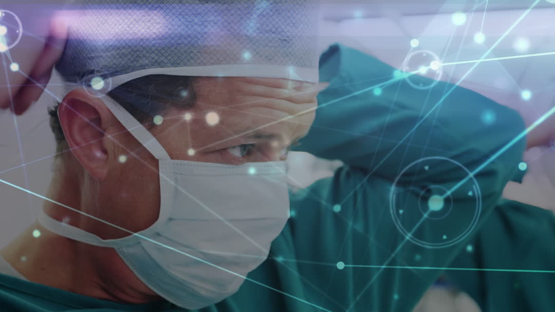 Image shows a surgeon wearing a mask and preparing in an operating room, with digital overlays of connected lines suggesting advanced technology or network integration in the medical field. This video is ideal for illustrating modern healthcare advancements, medical technology concepts, or the importance of digital data in hospitals.