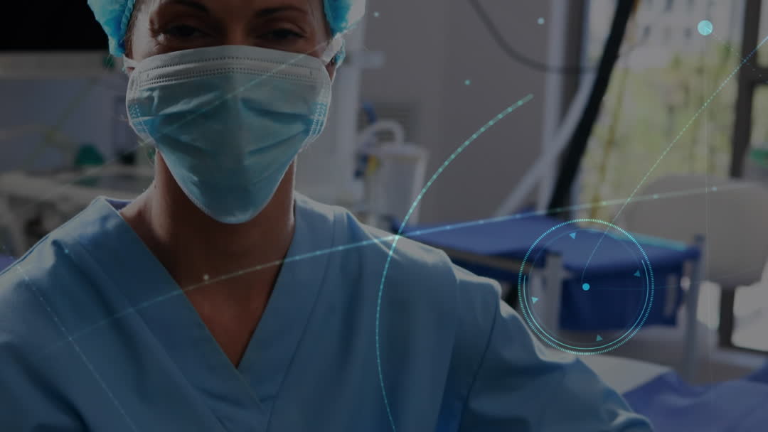 Medical professional wearing surgical mask and scrubs in operating room with digital graphics, conveying modern healthcare. Concepts include advances in medical technology, surgery room environment, and operating room professionals. Ideal for health industry promotions, educational purposes, and healthcare technology demonstrations.