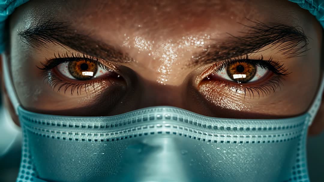AI Generated Video. Closeup video showing surgeon maintaining focused gaze during surgery, capturing intense brown eyes framed by surgical mask and cap, with glistening perspiration reflecting operating room lights. Footage conveying concentration, professionalism, and high-stakes focus of frontline healthcare. Ideal for supporting medical training videos, surgical technique tutorials, hospital websites, health news segments, safety and PPE campaigns, and stock footage libraries. Pairing suggestions: combining with calm instrumental music for training sequences, adding dramatic score for documentary scenes, overlaying bold text for awareness campaigns. Technical notes: tight closeup framing, shallow depth of field, teal-blue mask creating color contrast against warm skin tones, visible specular highlights on eyes. Licensing notes: licensing available for commercial, editorial, and educational projects.