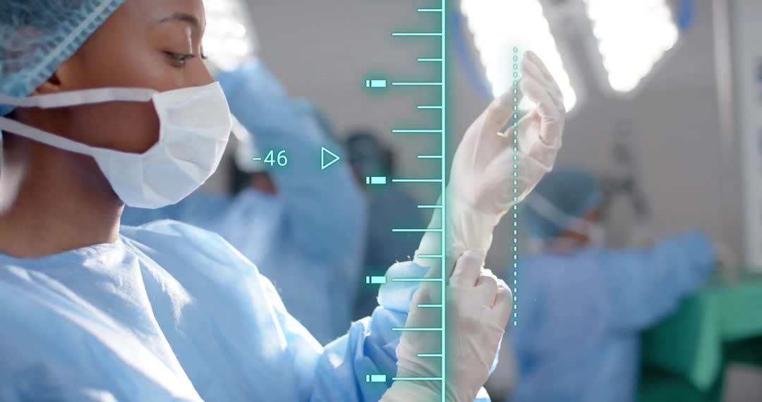 This scene portrays a surgeon meticulously putting on gloves in an operating theater while integrated with a digital data overlay, encapsulating the blend of modern technology with medical excellence. This visual synergy can be used in healthcare technology industries for promoting modern surgical tools, highlighting advancements in medical procedures, or illustrating the implementation of digital health information systems.