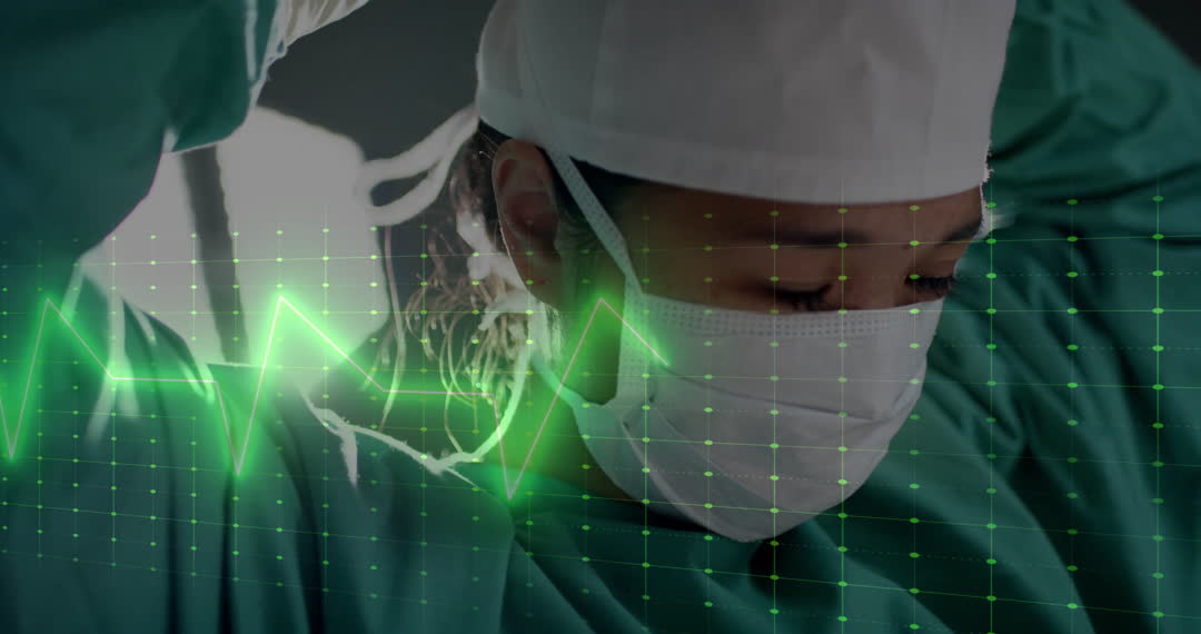 Surgeon in operating room adjusting mask shows dedication to healthcare and surgery. Animated green heartbeat against medical grid adds modern technology theme, suitable for hospital publications, educational materials, or health tech promotions. Imagery represents readiness and technological advancements in surgical practices.