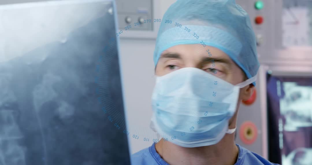Footage showing male surgeon wearing surgical cap and mask, reviewing radiograph with digital numeric overlay in hospital operating room. Scene focusing on clinician concentrating on radiograph details while HUD-style measurement markings and monitor panels providing technological context. Serving for illustrating radiology workflow, intraoperative imaging, real-time diagnostics, surgical planning, and medical technology integration. Suiting medical presentations, training videos, hospital websites, healthcare marketing, news segments about medical imaging, and educational courses on imaging interpretation. Offering composition allowing close-up of clinician face and monitor for cropping into banners, thumbnails, hero headers, and social media clips. Being ideal for editorial coverage about radiology advances or commercial campaigns for imaging equipment and surgical software. Avoiding use for identifying individuals or implying diagnosis of specific patient.