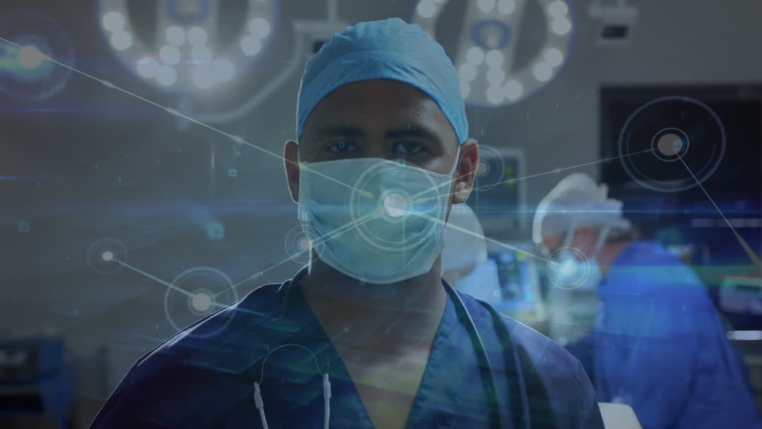 Surgeon wearing surgical cap and mask in an operating room with digital network graphics overlay, illustrating intersection of healthcare and modern technology. This concept can be used in healthcare technology promotions, medical services presentations, and communication materials emphasizing innovation in medical practices.