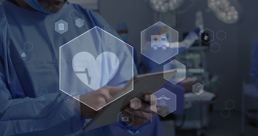 - Surgeon Using Tablet in Operating Room with Medical Symbols