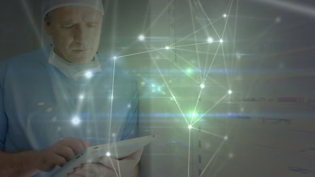 Surgeon wearing scrub uses tablet in hospital with digital network overlay. Conceptual video represents integration of technology in medical field, advancements in healthcare innovations, and data-driven treatment. Suitable for healthcare technology, modernization of medical practices, or digital transformation themes.
