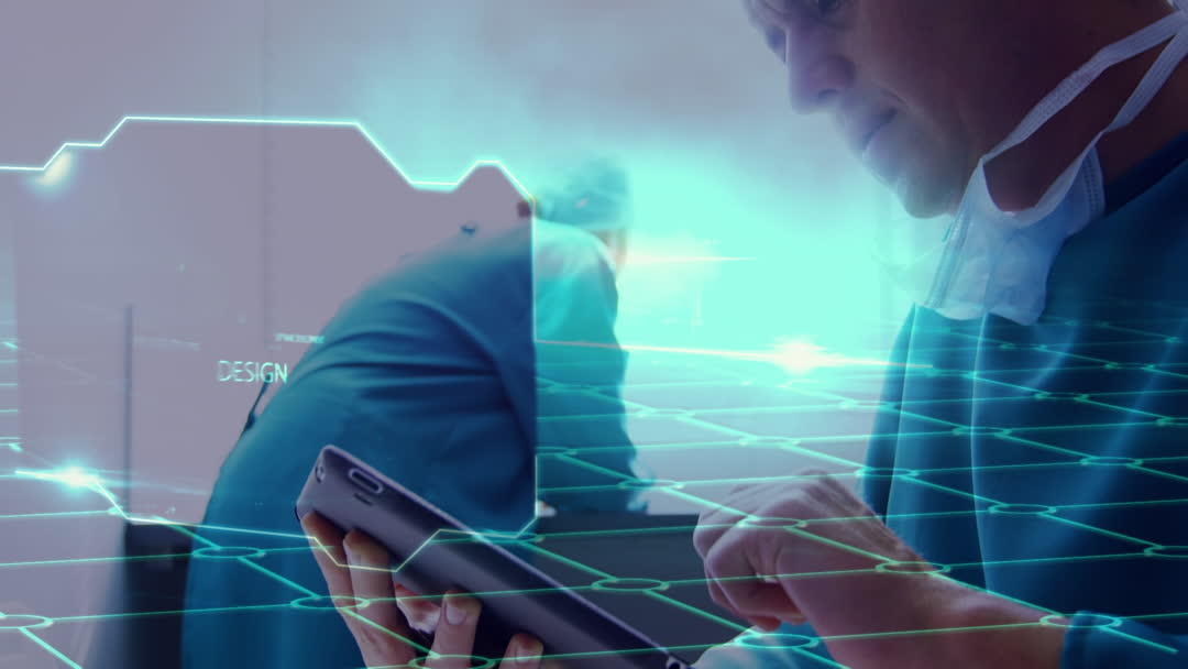 - Surgeon Using Tablet with Tech Overlay in High-Tech Operation Room