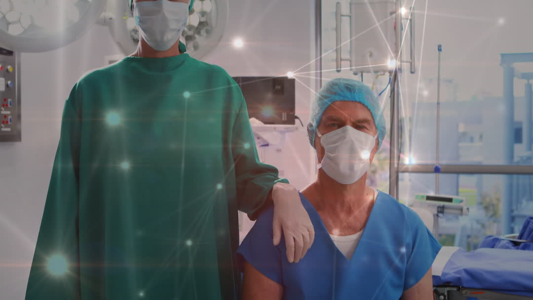 Surgeons wearing protective masks and scrubs pose confidently in a modern operating room with an overlay of digital network connections. This composition symbolizes the integration of futuristic technology in healthcare settings. Suitable for use in medical publications, articles about advances in digital health technology, or promotional materials for healthcare innovations.