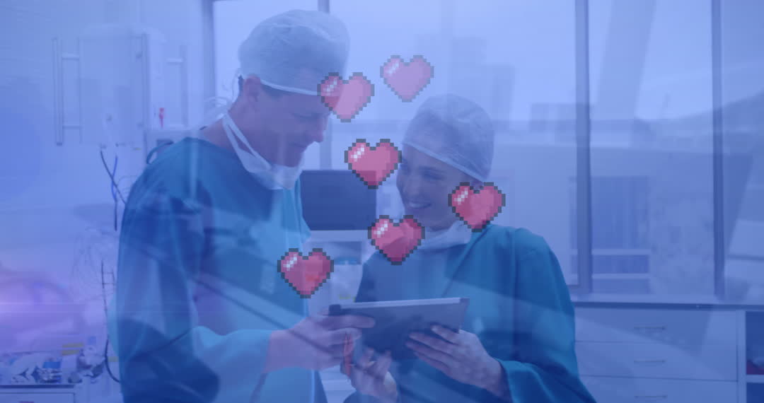 Two surgeons in operating room collaborating using a digital tablet with digital animations overlaying their work. The video blends advanced healthcare practice with technology, showcasing teamwork and innovative approaches in a hospital setting. This can be used in projects about the importance of modern medical technology, teamwork in healthcare, and integrated health practices in challenging times such as pandemics.