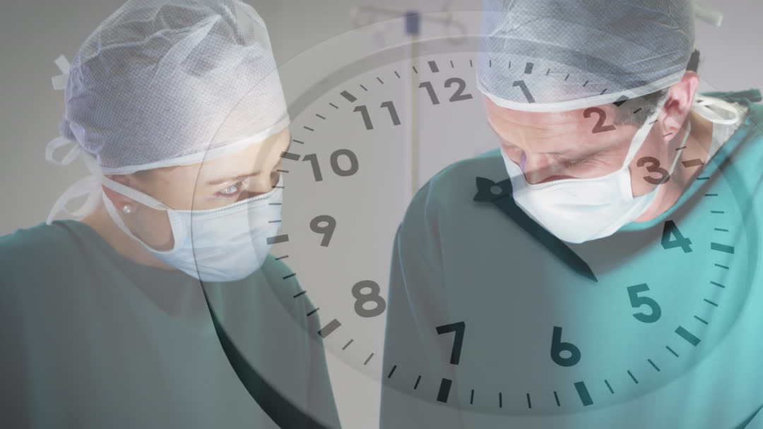 This visual combines the video of focused surgeons with a timepiece, emphasizing the vital nature of time management in medical surgeries. Ideal for healthcare presentations, articles on surgical procedures, or content stressing the importance of collaboration and timeliness in healthcare settings.