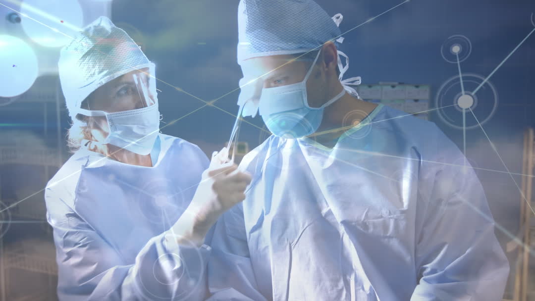 Healthcare professionals wearing surgical attire working together, with a digital network overlay, symbolizes the integration of technology in the medical field. This videory is ideal for healthcare articles, technology in medicine features, or informative content about collaborative medical practices.