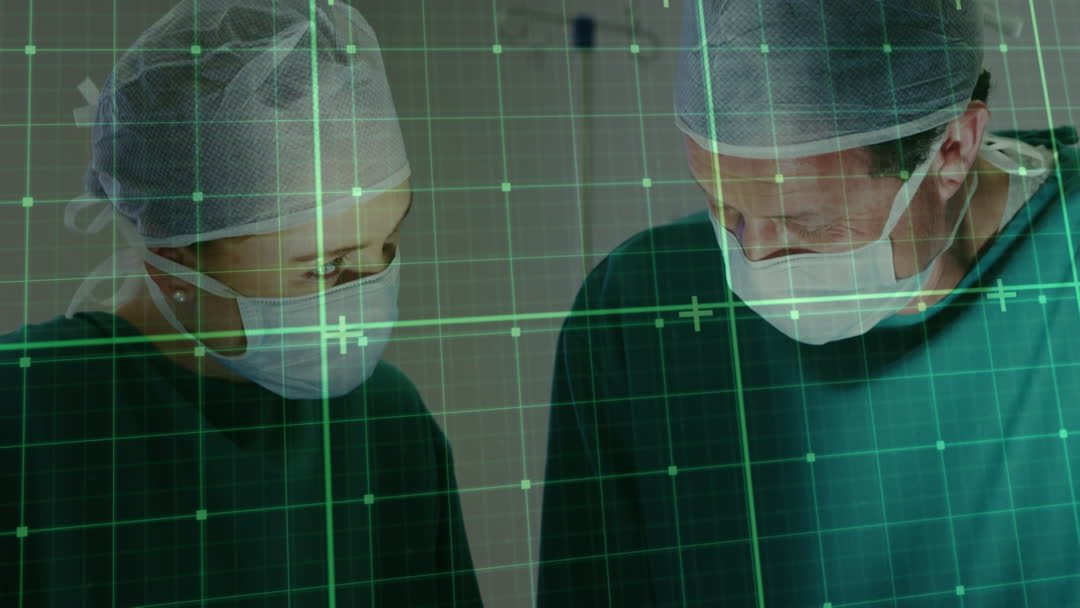 Doctors wearing surgical masks and caps are consulting tools displayed via data overlay. The digital interface illustrates high-tech integration in a medical context, enhancing surgical precision and collaboration. Useful for topics on medical technology advancements, modern healthcare, and innovative surgical practices.
