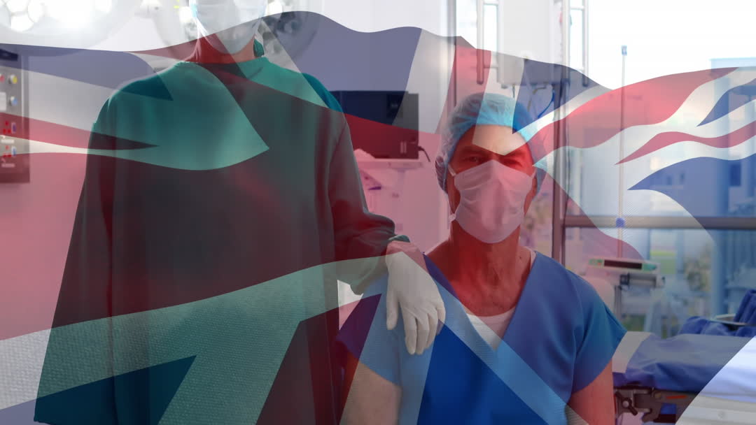 This visual depicts surgeons wearing PPE in a hospital environment, symbolically layered with the British flag, reflecting the dedication and patriotism of healthcare professionals. Perfect for promoting healthcare initiatives, patriotism-themed campaigns, or documentaries about the UK's medical field.