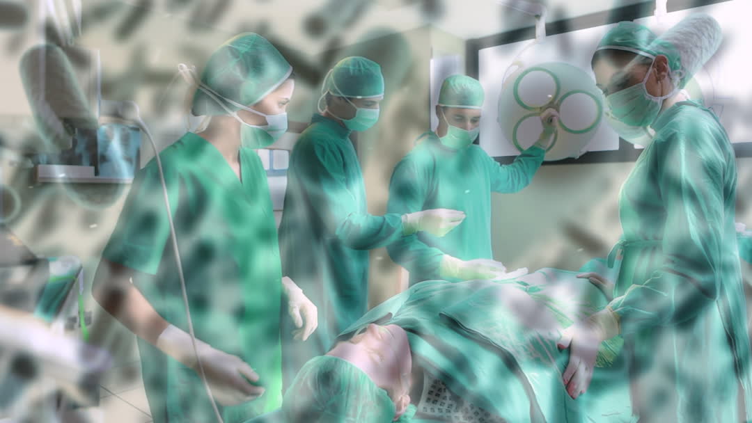 Surgeons in Operating Room with Overlay of COVID-19 Cells Concept Video