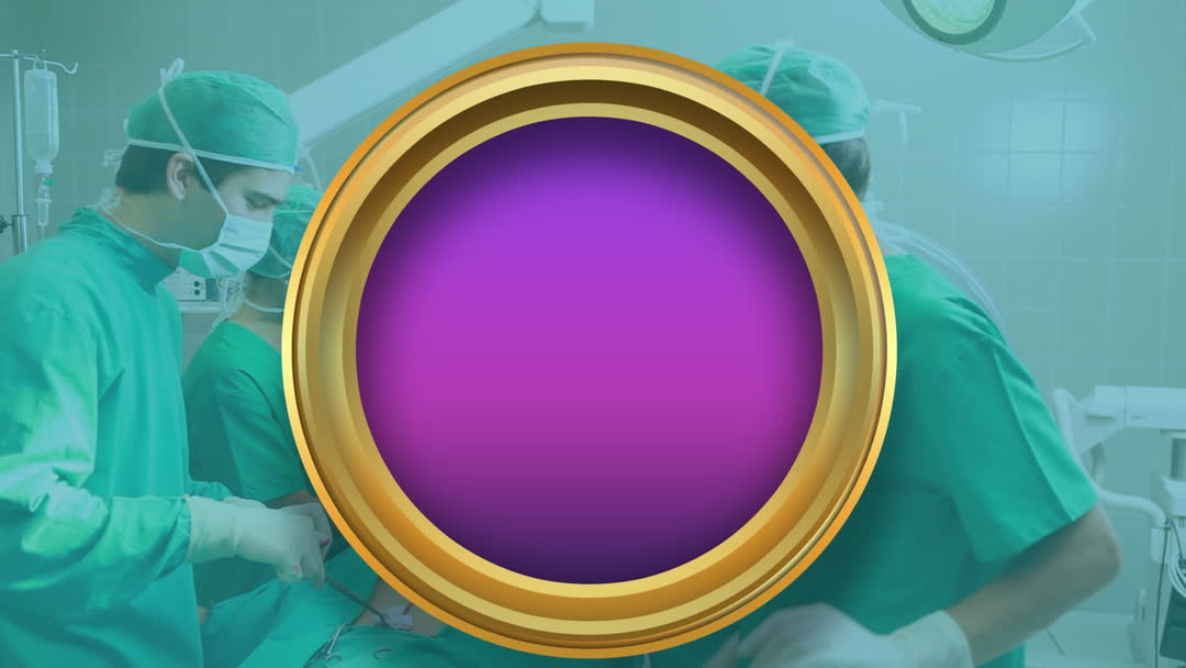 Medical personnel are seen working together in a surgical theater wearing green attire and surgical masks, focused on a procedure. An animated circle featuring gold and purple colors digitally overlays the scene. This could be used to illustrate global healthcare advancements, medical animations, or in digital content presentations about the medical field.