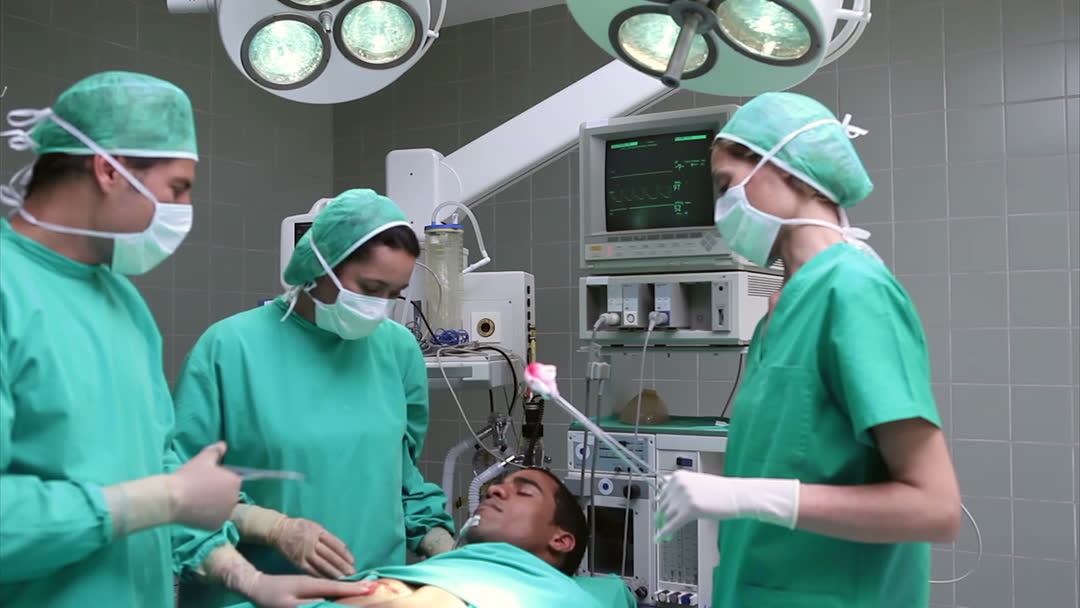 Medical professionals in green scrubs collaborate during a surgical procedure on a male patient in an operating room. The environment is equipped with advanced surgical lights and monitoring equipment, highlighting the importance of teamwork and precision in healthcare settings. This video is suitable for illustrating articles or media related to medical practices, surgical techniques, healthcare training, or hospital environments.