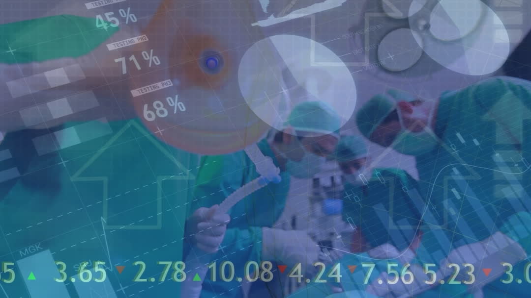 This video features a team of surgeons in an operating room with a digital overlay, showcasing medical data such as graphs and charts. The futuristic interface represents advanced healthcare technology and data-driven surgical procedures. Such visuals are ideal for use in healthcare technology presentations, publications on innovative surgical developments, and promotional content related to medical research advancements.