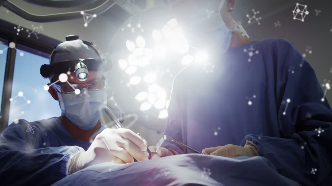 Surgeons in an operating room performing surgery with an overlay of animated molecular structures symbolizes the integration of advanced technology and medical science. The video connects modern medical practices with data analytics and research. Ideal for use in medical presentations, educational materials, or articles discussing the fusion of healthcare and technology advancements.