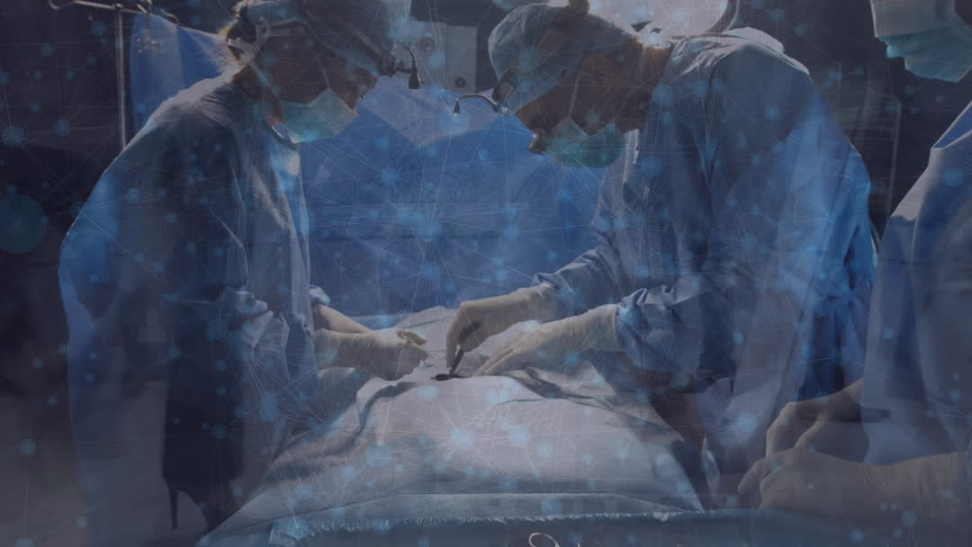 Team of surgeons performs a surgical procedure, illustrated with a digital network graphic overlay conveying technological innovation in healthcare. The scene highlights advanced medical practices and the integration of digital solutions in surgery. Suitable for use in articles or educational materials discussing medical technology, innovative healthcare practices, or the future of surgery.