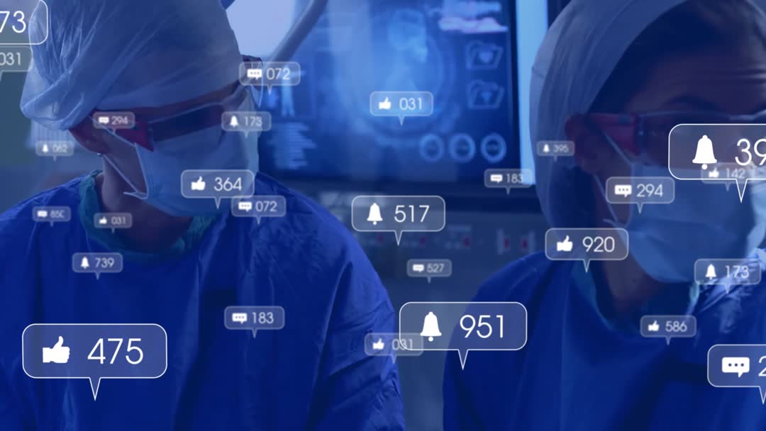 Surgeons in an operating room focusing on a 3D brain scan. Floating digital alerts show increasing metrics, suggesting dynamic and real-time feedback in the surgical environment. Ideal for use in articles, presentations, or educational content related to advancements in medical technology, the role of data in healthcare, or the future of surgery.