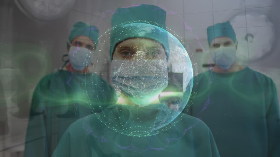 Surgeons wearing face masks with an animated digital globe overlay suggest advancements in global medicine and healthcare technology. This visual representation emphasizes the integration of technology in medical fields, suitable for use in campaigns or articles focusing on telemedicine, global healthcare collaboration, or the future of surgical practices.