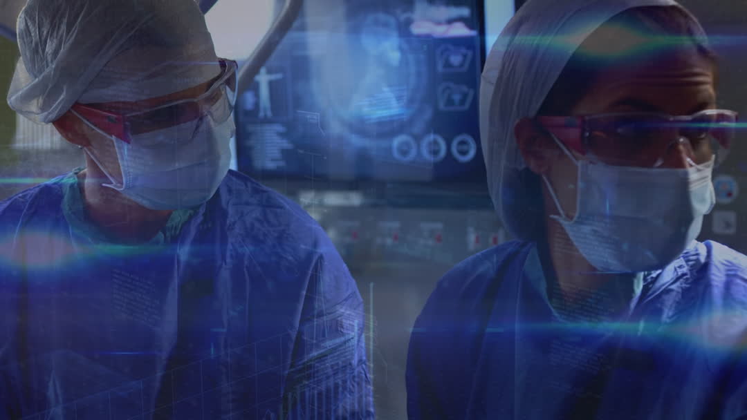 Medical professionals focused with digital interface overlay, representing advanced medical technology's integration into surgery. Suitable for illustrating modern healthcare innovations, team collaboration in healthcare, and high-tech medical environments.