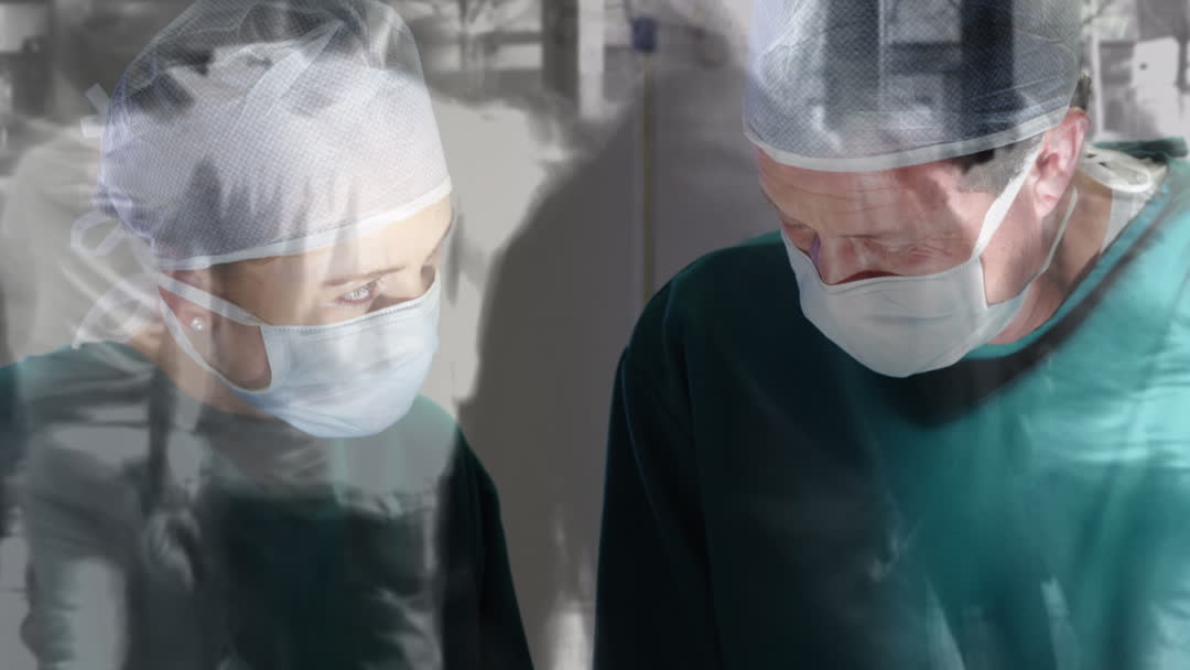 Two surgeons in surgical attire focus on performing a complex medical task, overlaid with a timelapse visual of people walking in a city. This videory captures the high-stakes environment of healthcare surgeries amidst the bustling rush of urban life. Useful for depicting concepts in healthcare, stress environments, multitasking, or illustrating the integration of modern medicine with fast-paced city dynamics. Ideal for educational content, healthcare articles, and urban life discussions.