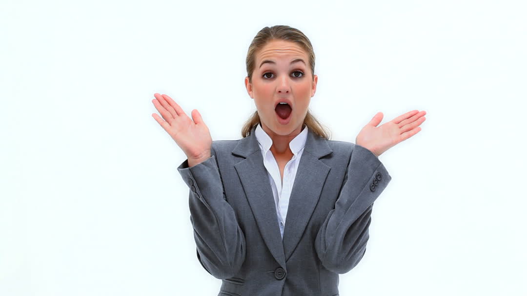 Businesswoman expressing surprise while wearing formal attire against a white background. This video visually conveys emotions such as astonishment or unexpected news, ideal for use in campaigns related to business training, corporate communications, emotional expressions in workplace settings, or advertisements that focus on unexpected outcomes.