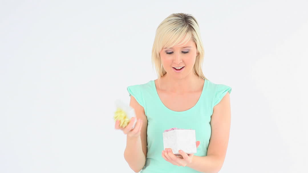 Surprised Woman Receiving Gift in Minimalist Studio Video