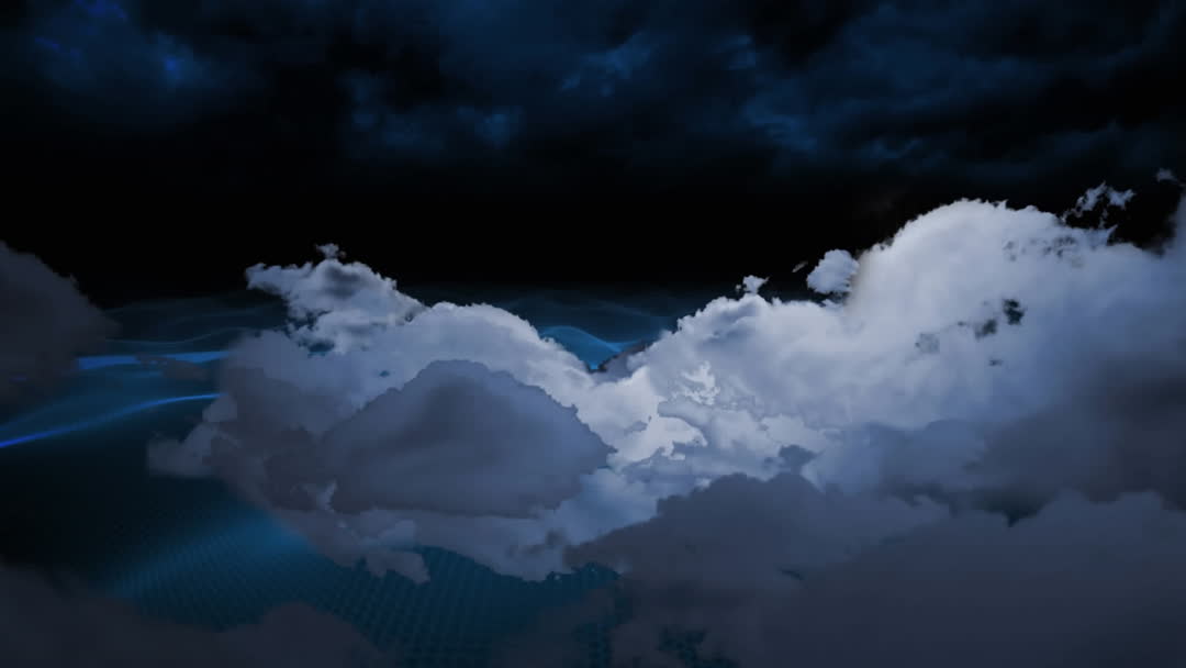 This visual shows a surreal combination of animated clouds floating over abstract futuristic patterns with blue tones, creating a digital interface atmosphere. Ideal for use in technology presentations, innovative advertisements, or design inspiration showcasing abstract concepts in digital art or cloud computing.