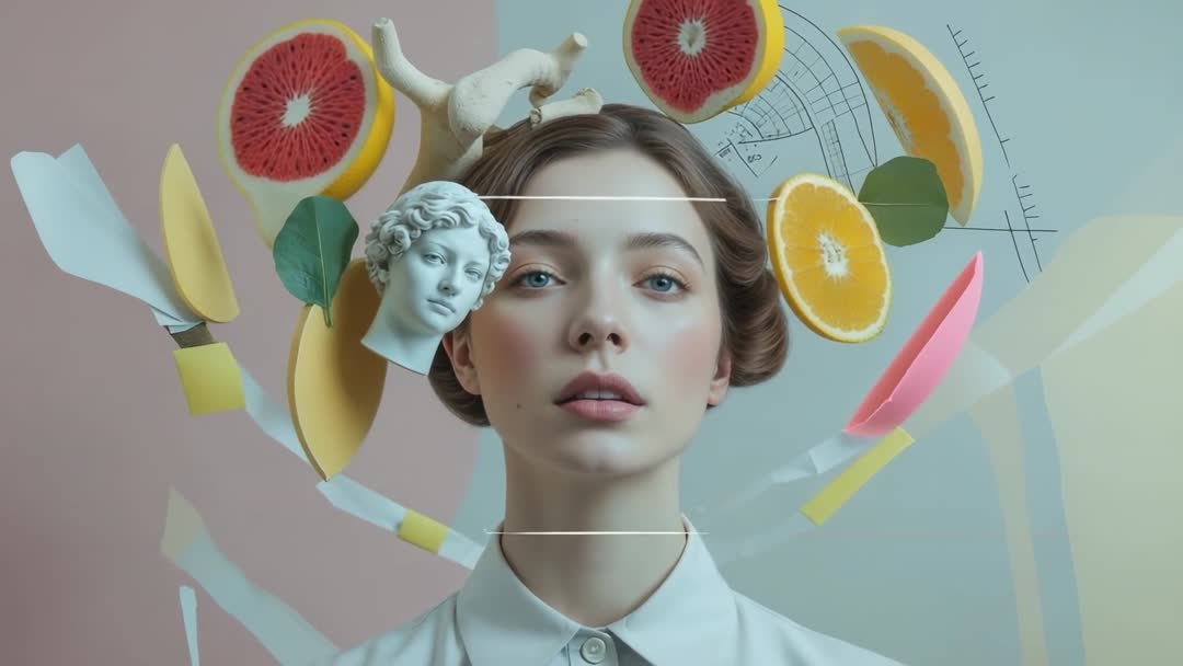 AI Generated Video. This surreal artwork captures a blend of fruit and sculpture elements orbiting around a woman's head, set in an art studio theme. The minimalist yet vibrant composition showcases grapefruit, orange slices, and artistic elements in a contemporary and abstract style, ideal for projects focusing on modern art, creative thought, or surrealism. It suits use in art magazines, digital illustrations, and educational materials about artistic concepts and history.