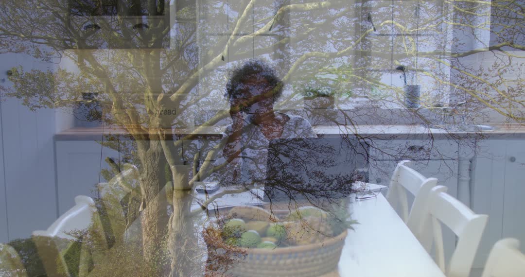 A creative fusion video mixing natural elements with interior space, featuring the reflection of tree branches within a kitchen and dining setup, one person visible sitting at a table. Integrate into projects exploring the harmony between nature and modern living or use in hospitality and interior design sectors highlighting sustainability and creative spaces.