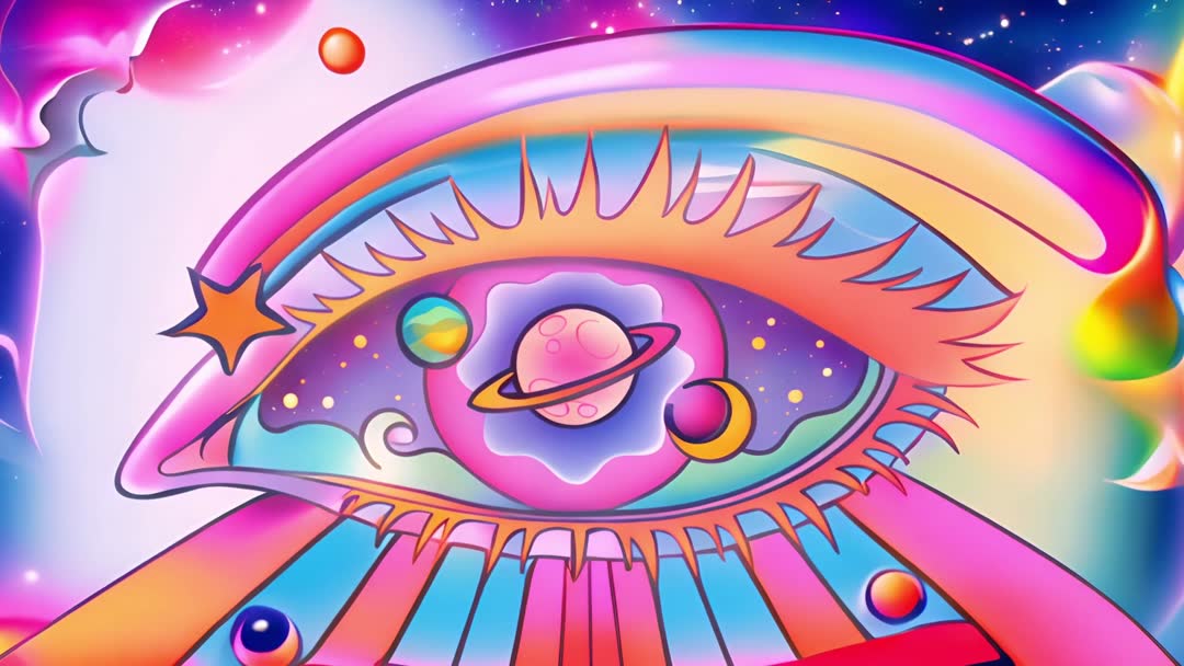 AI Generated Video. Vibrant illustration features a cosmic eye surrounded by planets and stars, enveloped in a surreal and psychedelic theme. This colorful depiction of space integrates abstract art with fantasy elements, resonating with themes of universe exploration and mysticism. Ideal for use in astrology-themed projects, science fiction movie graphics, eclectic home decor, or any creative venture looking for a burst of cosmic inspiration.