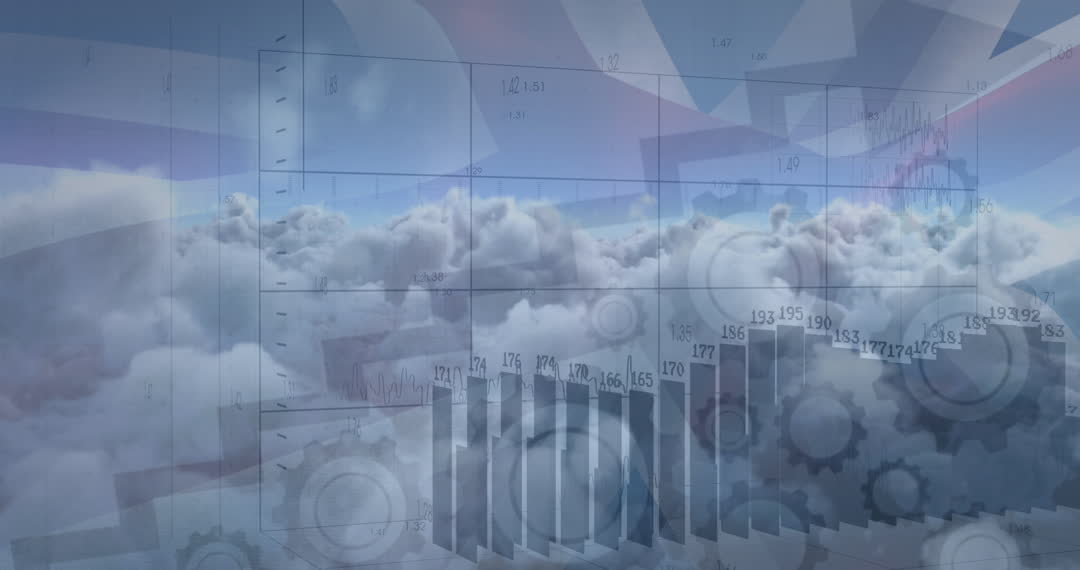 Ideal for representing connecting finance and economy with the atmosphere of the United Kingdom, incorporating cloudy visuals with graphs and arrows demonstrating financial trends. Useful for business presentations, economic analysis reports, and atmospheric visuals.