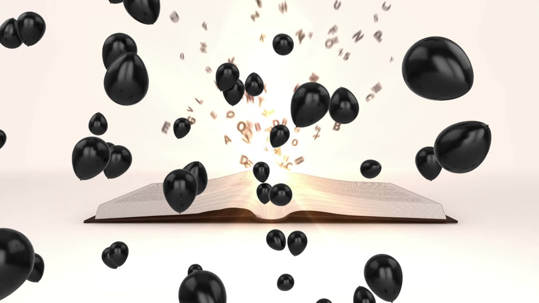 This video presents a surreal and abstract concept with floating black balloons over an open book emitting flying letters. Ideal for depicting creativity, imagination, and the magic of literature. This could be effectively used in contexts related to storytelling, creativity workshops, or literary events.