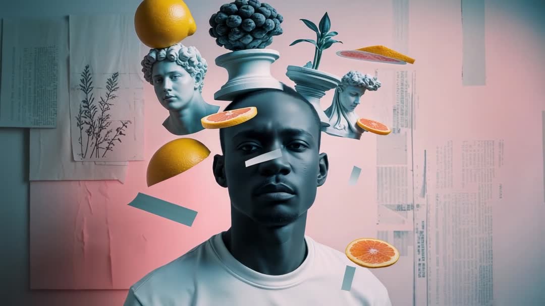 Surreal Floating Elements with Introspective Expression in Art Collage Video