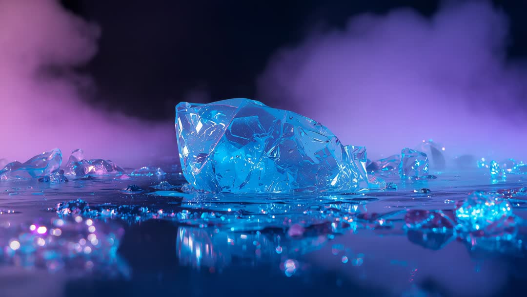 AI Generated Image. This scene presents a mesmerizing close-up of an ice chunk set against a vibrant background featuring shifting colors and a mysterious haze. The crystalline textures of the ice, in conjunction with the lush purples and blues, create an atmosphere that could symbolize tranquility, beauty, or fantasy. Use this visual element in digital designs or video backdrops where a serene yet dramatic effect is desired. Perfect for illustrating themes of transformation, serenity, and abstract beauty in various artistic projects.